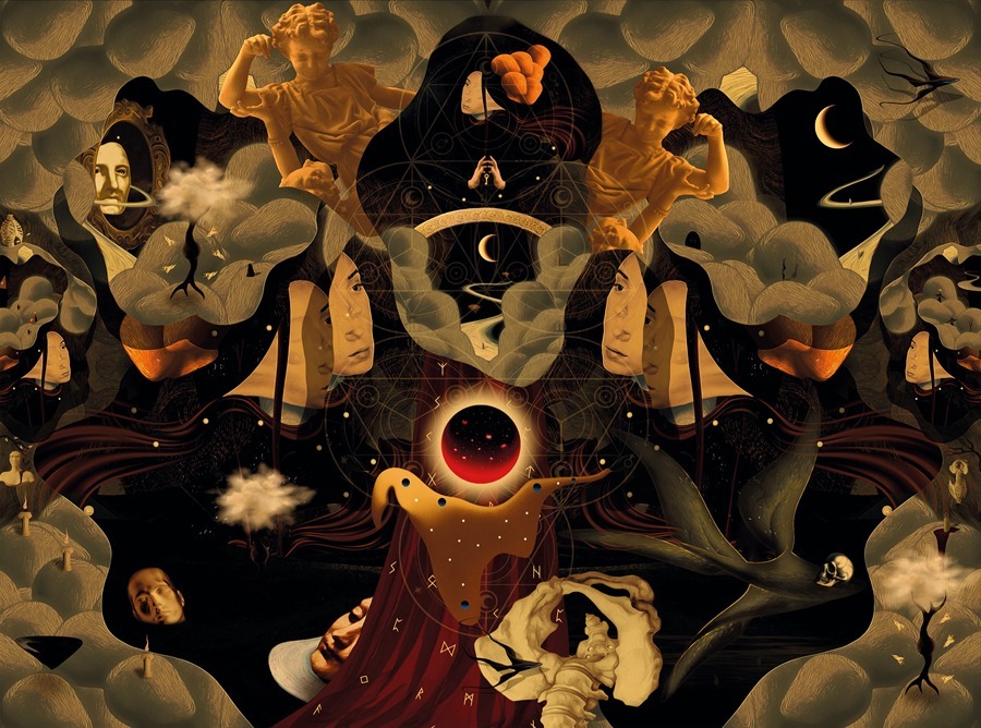 Así, cada obra deviene portal. En una, dos templos flotantes cruzan un cielo apocalíptico, mientras figuras encapuchadas transitan un paisaje ígneo bajo lunas partidas y signos indescifrables. En otra, un eclipse sangrante se alza sobre un vórtice de geometrías esotéricas, donde rostros duplicados y nubes simbólicas danzan bajo la vigilancia de cuerpos celestes. En una tercera imagen, cuerpos clásicos se enredan en espirales imposibles, como si el tiempo se hubiera fracturado en capas simultáneas de deseo, violencia y contemplación. Y en una cuarta visión, una figura solitaria –un alquimista o un iniciado- se eleva en medio de una escena suspendida, rodeado de materia fluida, objetos irreconocibles y sustancias que parecen pensarse a sí mismas, como si el subconsciente se hubiera licuado y flotara a su alrededor, componiendo una atmósfera donde lo real y lo irreal se funden sin frontera.